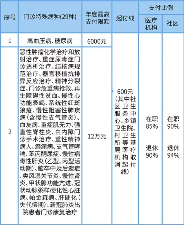 2.門(mén)診特殊病種的起付線與普通門(mén)診統(tǒng)籌起付線合并統(tǒng)一,參保人員有兩個(gè)以上門(mén)診特殊病種按一個(gè)起付標(biāo)準(zhǔn)計(jì)算。