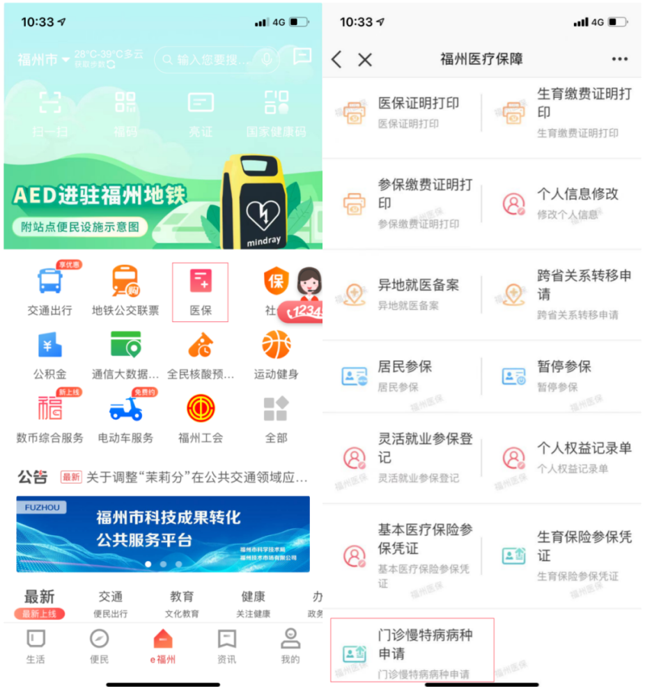 操作步驟:進(jìn)入“e福州”APP,點(diǎn)擊“醫(yī)保”,在“業(yè)務(wù)經(jīng)辦”中點(diǎn)擊“門(mén)診慢特病病種申請(qǐng)”,進(jìn)入信息填報(bào)界面,按要求填寫(xiě)基本信息和申請(qǐng)信息,并上傳特殊病種申請(qǐng)表和出院小結(jié)或診斷證明書(shū),點(diǎn)擊“保存”即可。