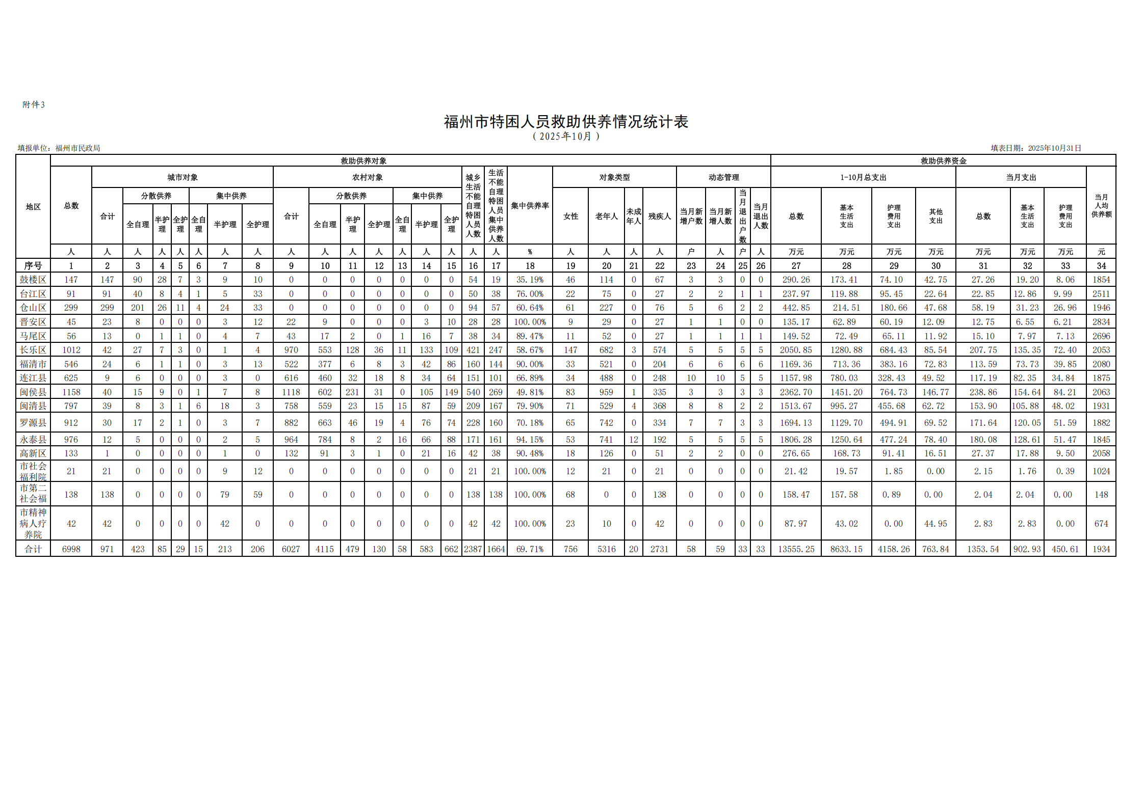 2025-10福州特困人員救助供養情況統計表