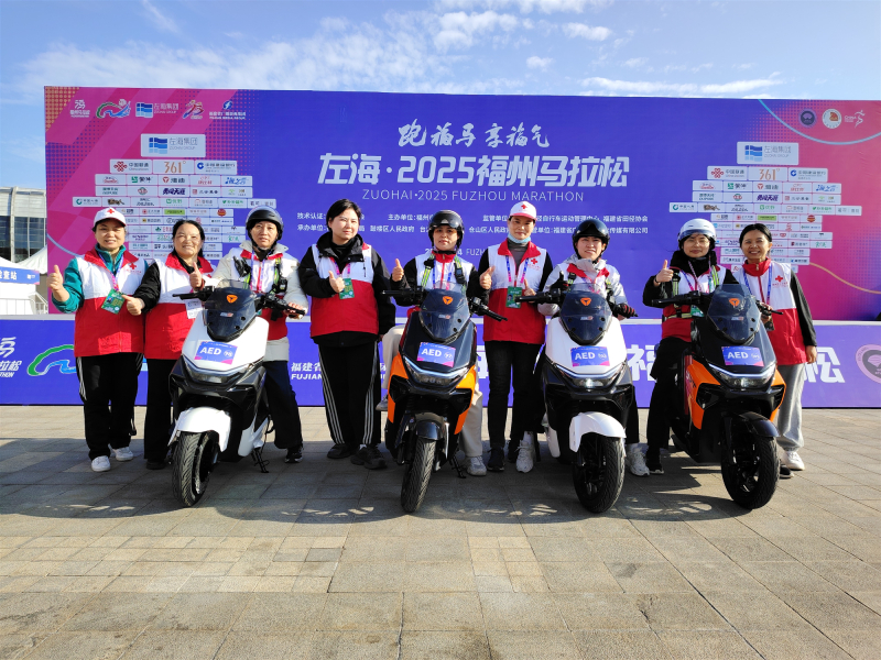 賽事當天,由福州市紅十字會面向全社會招募選拔的102名AED騎行應急救護志愿者,化身賽道上最靈動的“生命防線”。這支由紅十字救護師資和在職醫護人員組成的專業隊伍,騎著配備AED設備和急救包的巡回電動車,沿優化后的賽道分段巡邏,每公里賽道安排2部車輛來回值守,實現全程無死角覆蓋。賽事中,騎行志愿者憑借扎實的急救技能和敏銳的觀察能力,對出現體力不支、肌肉痙攣等狀況的選手第一時間介入幫扶,累計提供應急救助服務百余次。通過與賽事“一鍵報警+北斗實時定位”信息化指揮系統聯動,志愿者實時同步賽道情況,配合救護車、定點醫院及轉運路線,構建起“發現—干預—轉運”的快速響應鏈條,確保突發狀況高效處置,成為專業醫療力量的重要補充。