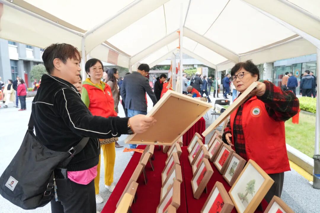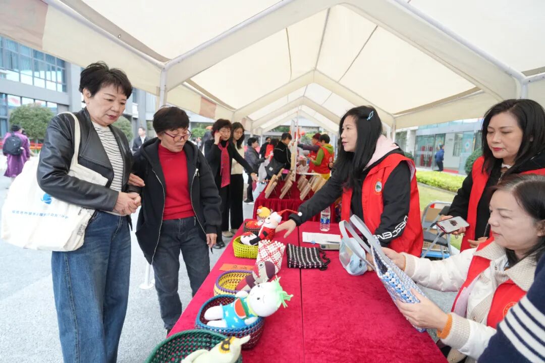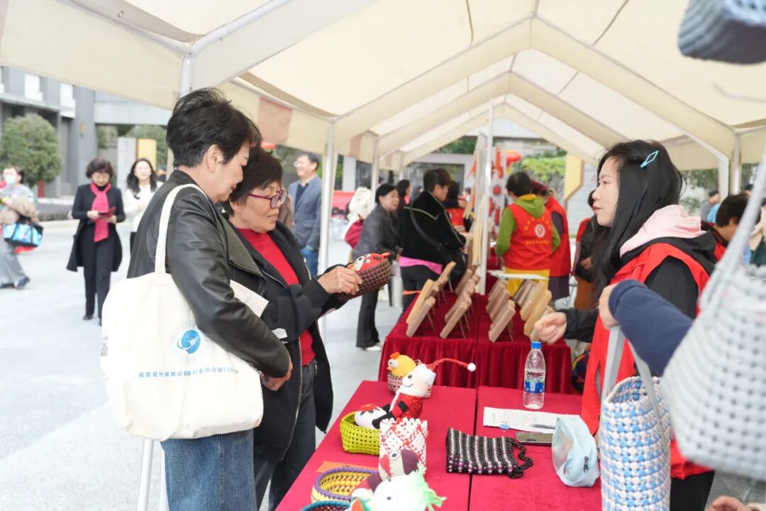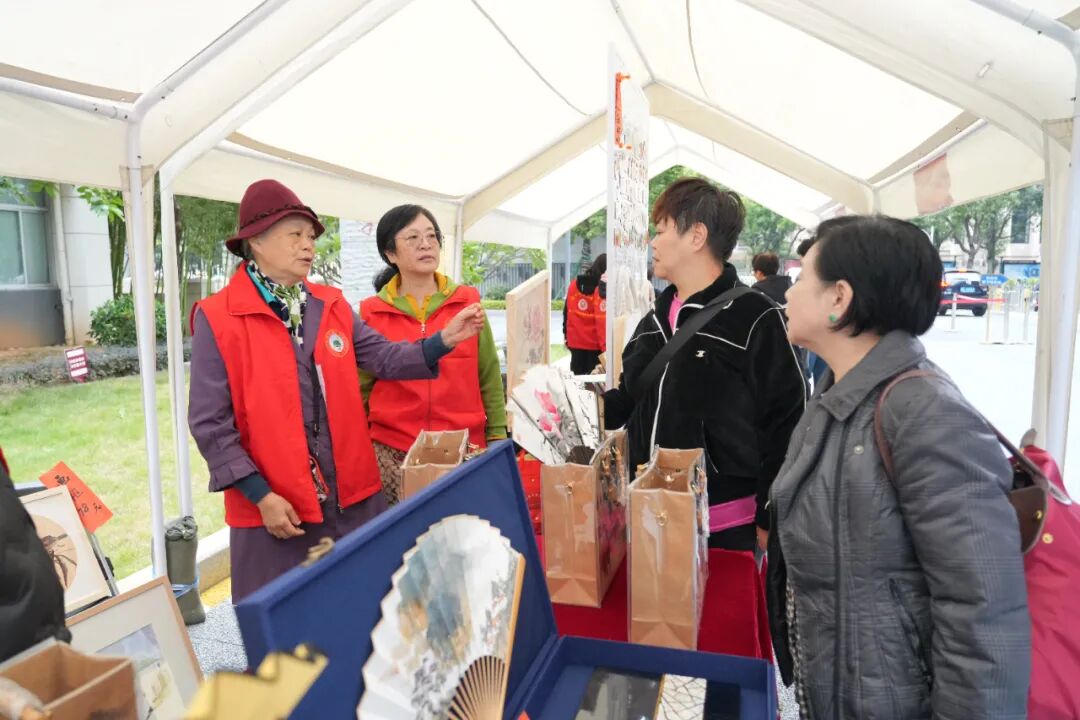 愛心義賣攤位前,大漆茶臺、藤編筐、手工玩偶、書畫擺件等手工作品琳瑯滿目,整齊陳列。這些精美物件皆出自老年學員之手,從構思設計到裁剪縫制、打磨上漆,無不凝聚著他們的巧思與心血。部分作品更融入福州古厝、山水等地方元素,兼具實用價值與濃郁的文化韻味。