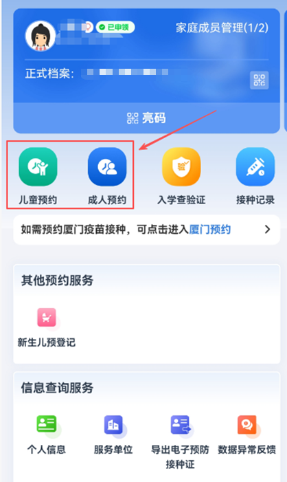 在電子預防接種證功能頁面點擊“兒童預約”或“成人預約”,進入預約頁面后,可以預約兒童或成人需要接種的疫苗。