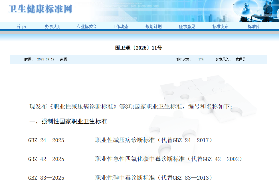 現(xiàn)發(fā)布《職業(yè)性減壓病診斷標準》等8項國家職業(yè)衛(wèi)生標準,編號和名稱如下: