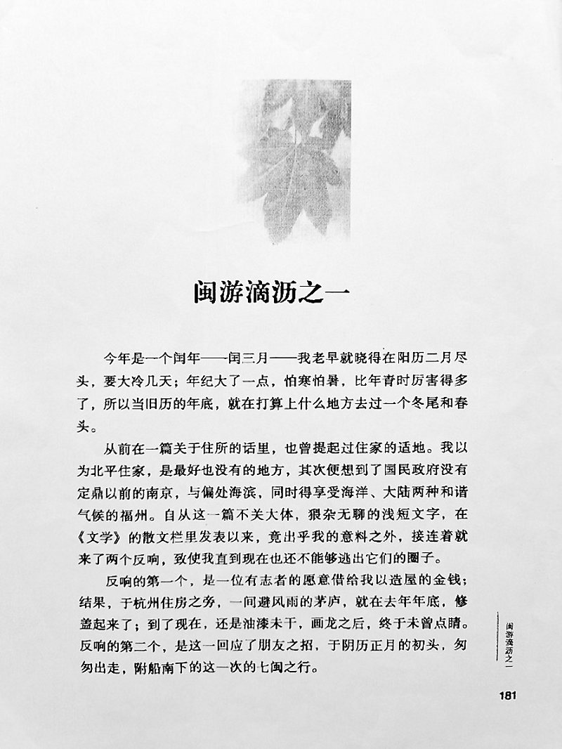 在看到福州10年間的巨大變化時,郁達(dá)夫不由自主地將福州與自己的10年相對比。“十年的歲月,在這里總算也留下了成績,和我自身的十年之前初到這里時的那一種勇氣勃勃的壯年期來一比,只覺得福州是打了一針返老還童的強(qiáng)壯針,而我卻生了一場死里逃生的大病,兩個面目,完全相背而馳了十年,各不能認(rèn)識各的固有形容了。”